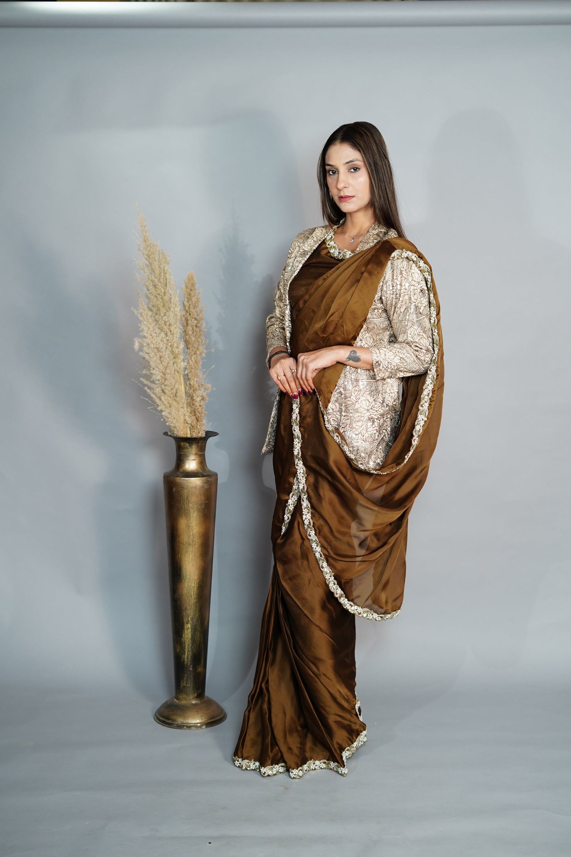This saree, crafted from luxurious crepe shimmer silk, offers a ready-to-wear solution for elegant occasions. It includes a tailored designer jacket and a coordinating belt, both in a sophisticated Mehndi color, providing a seamless blend of traditional and contemporary style. Perfect for those seeking a polished and refined ensemble with minimal effort.